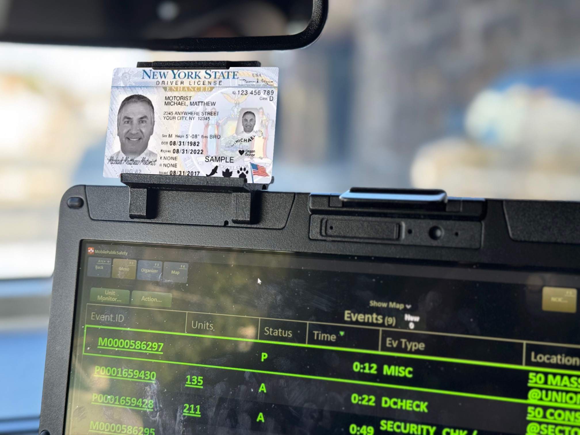 A Mobile Data Terminal (MDT) Laptop ID Holder designed to securely hold a person’s ID during a traffic stop, making it easier for officers to retrieve information while keeping their hands free.